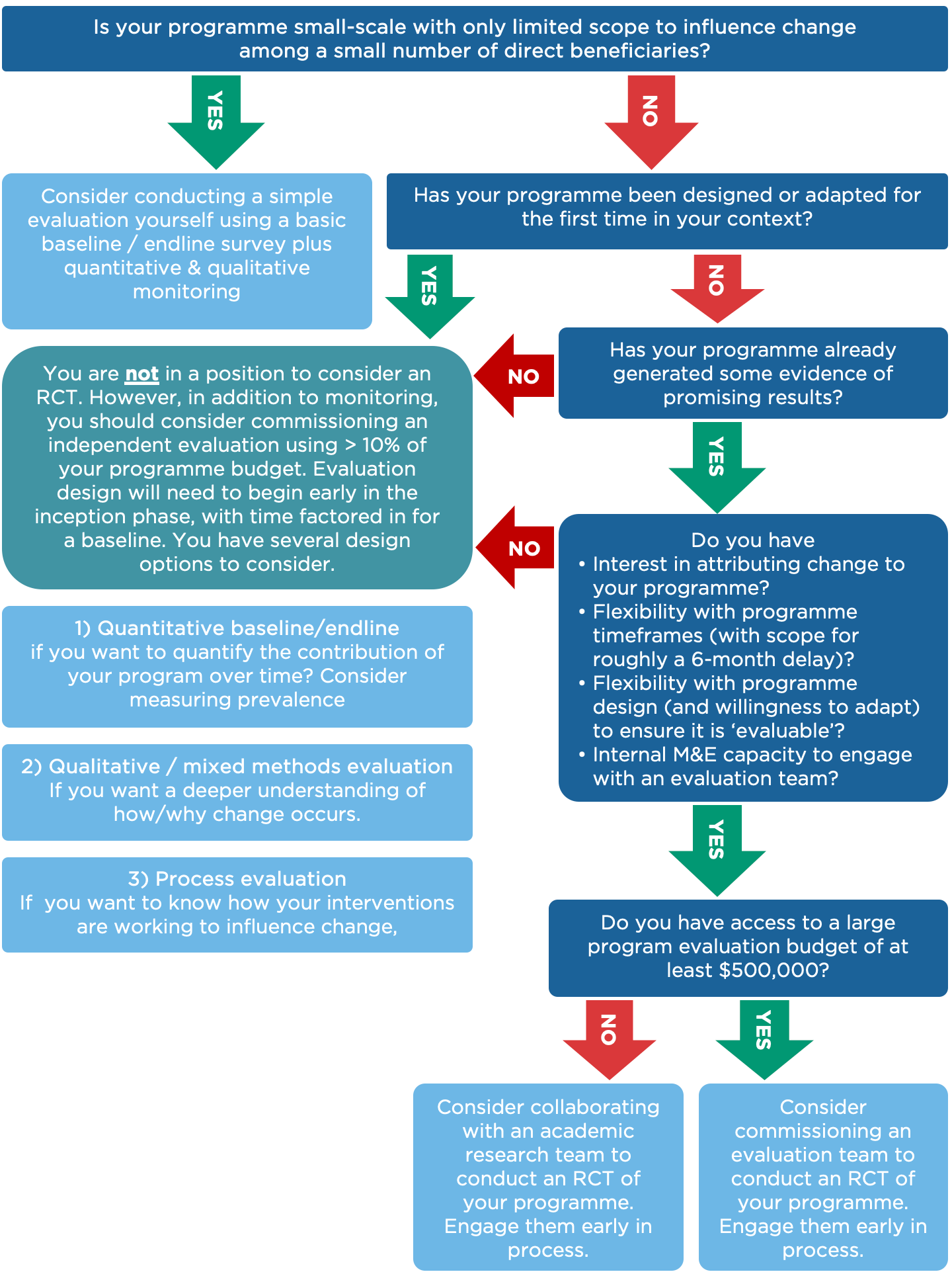 This flow diagram provides a high-level overview of the key decisions which you will need to make as early as possible in the design phase of your program – before timeframes, budgets and milestones have been agreed.