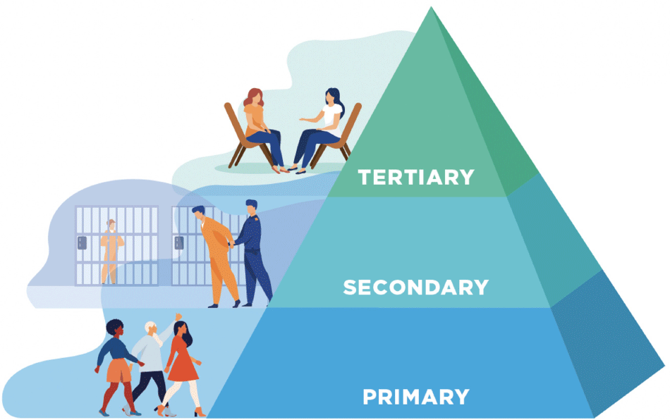 - Tertiary prevention: Tertiary Prevention or Response programmes aim to prevent and treat long-term problems for survivors and families as a result of violence. Examples of Tertiary Prevention programmes include psychosocial support, socio-economic assistance, and legal aid.